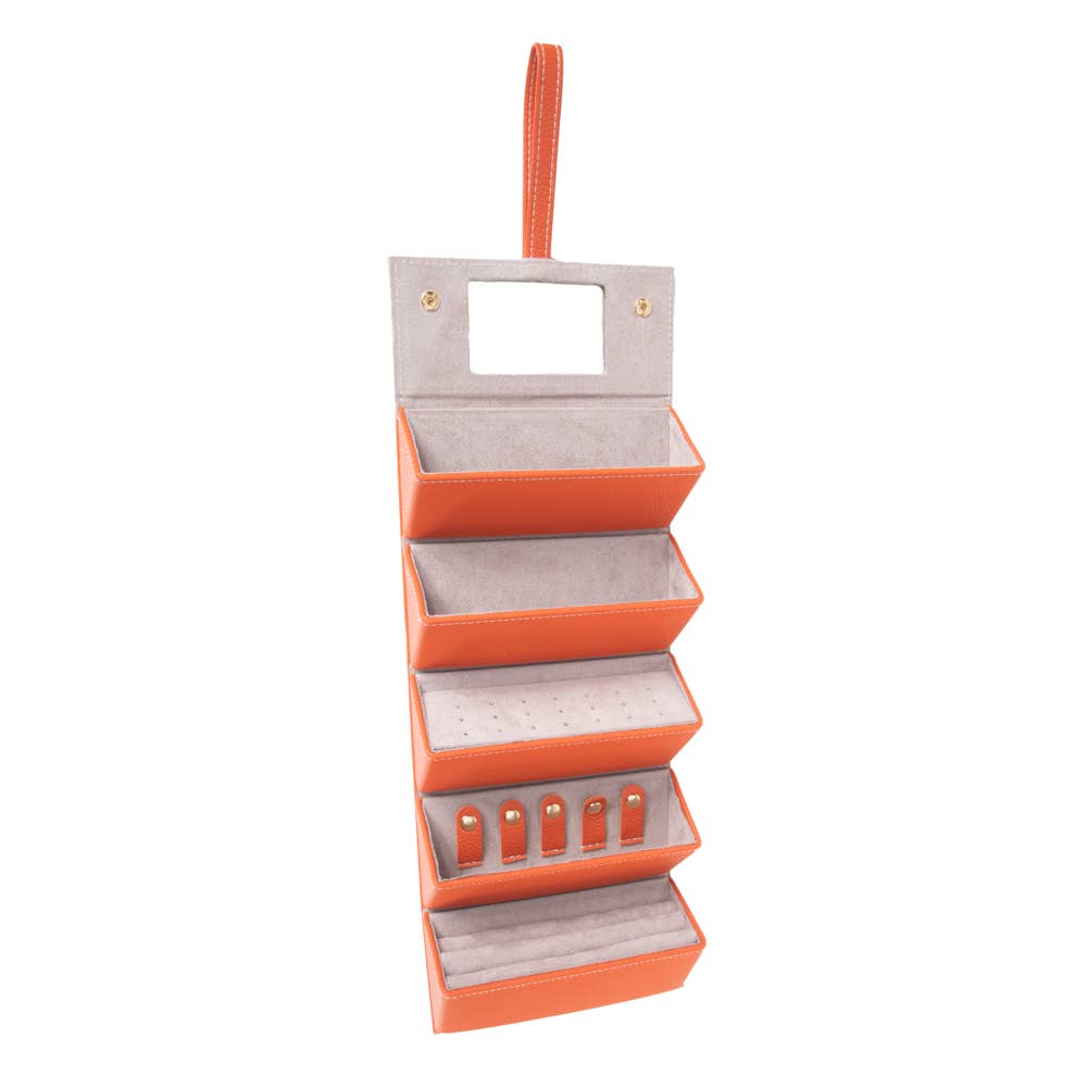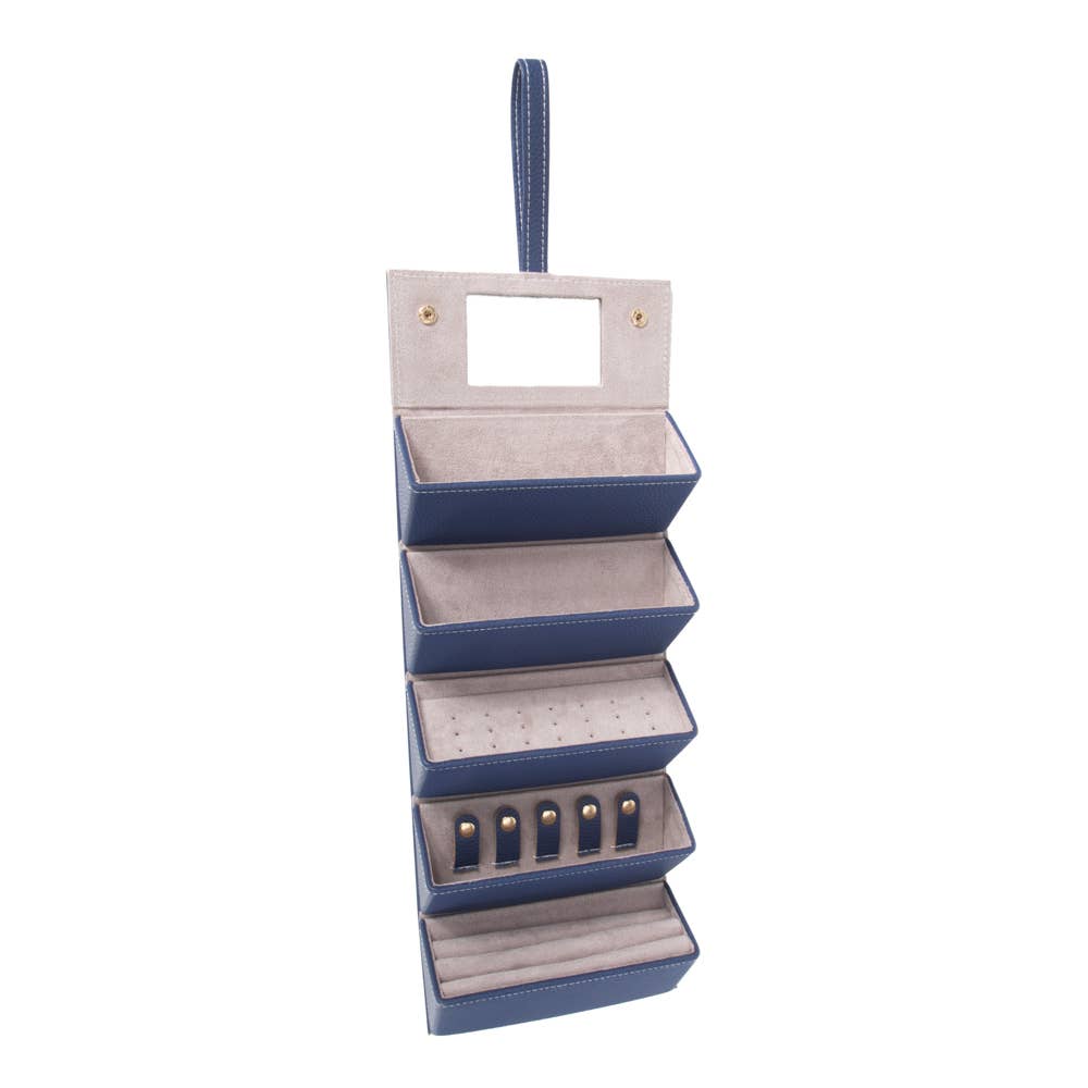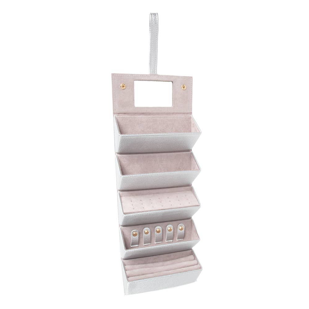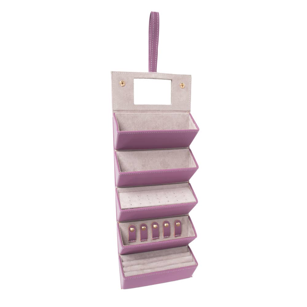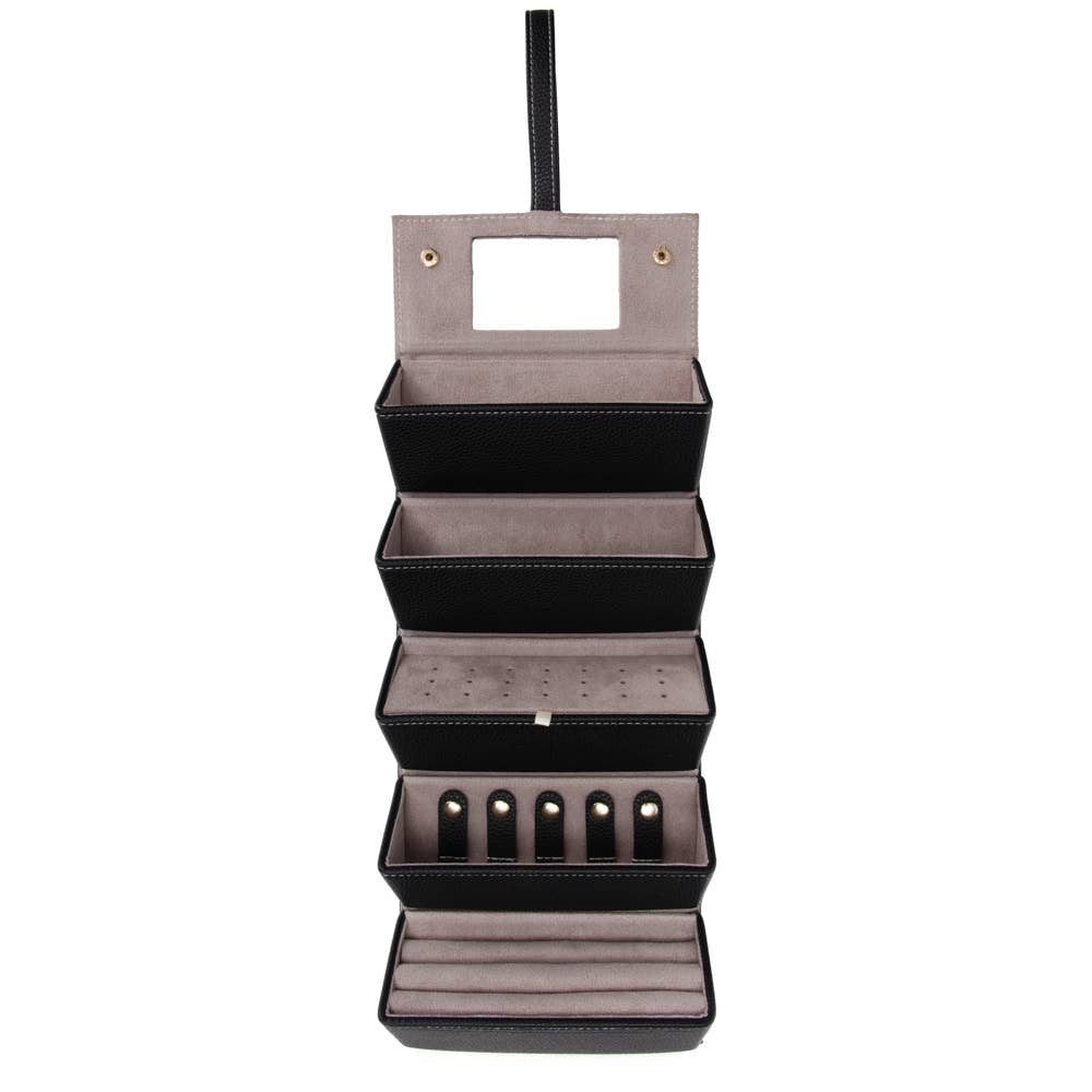 Meet the Leah 5 Eyewear & Jewelry Case - your ultimate accessory game-changer! Crafted from luxurious pebbled vegan leather with a soft velour interior, it’s designed to keep your eyewear and jewelry safe and sound. Its sleek snap closure ensures everything stays compact and portable, while the handy hanging loop offers easy access wherever you are. Inside, find a built-in mirror and smart compartments for seamless organization. It fits up to 2 pairs of sunglasses or reading glasses, secures 21 stud earrings with a special earring card, and even has a lift-up feature for your larger earrings. Plus, with 5 loop snaps, your bracelets and necklaces stay free from tangles, and 3 pillow rolls keep your rings snug. Get ready to elevate your accessory storage with style and sophistication!