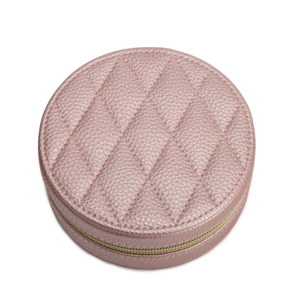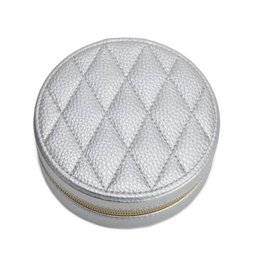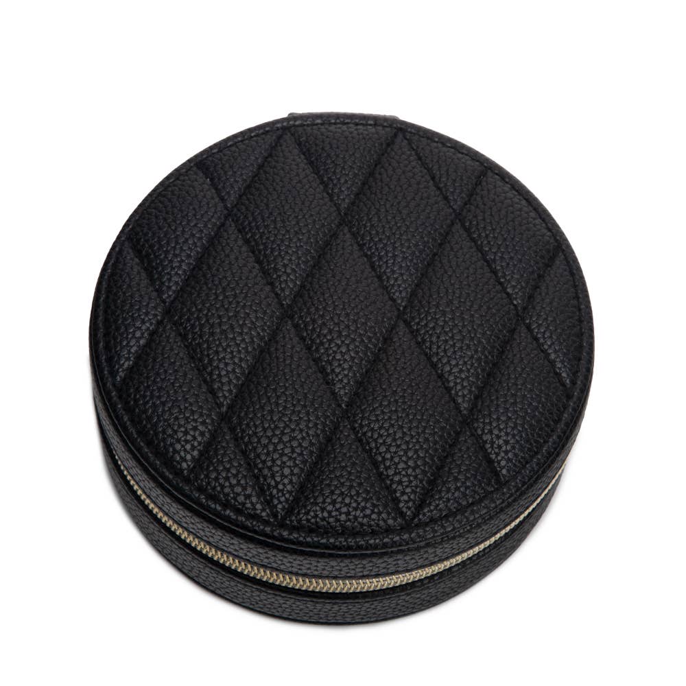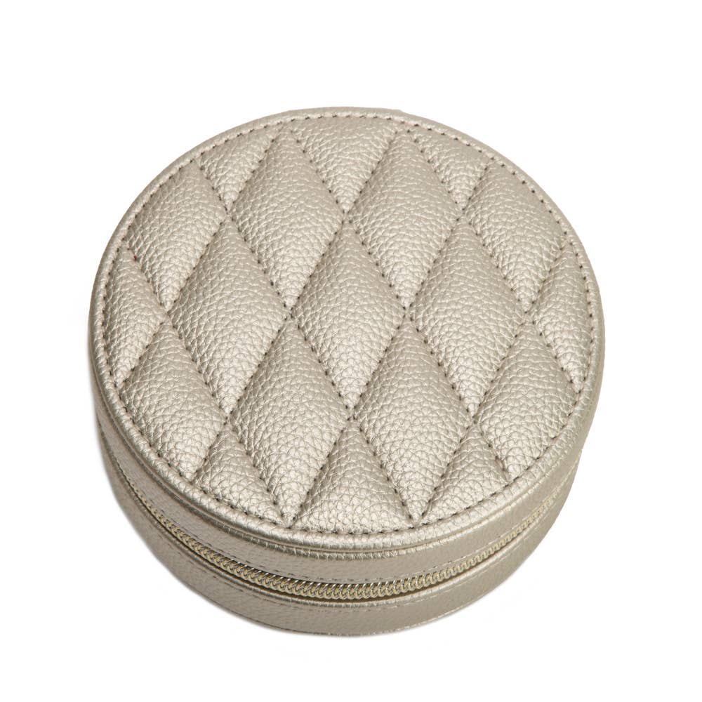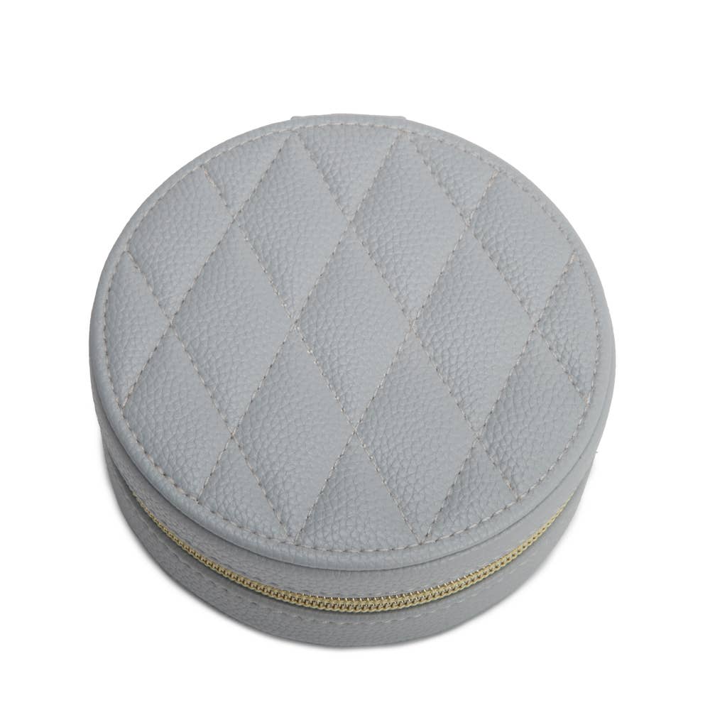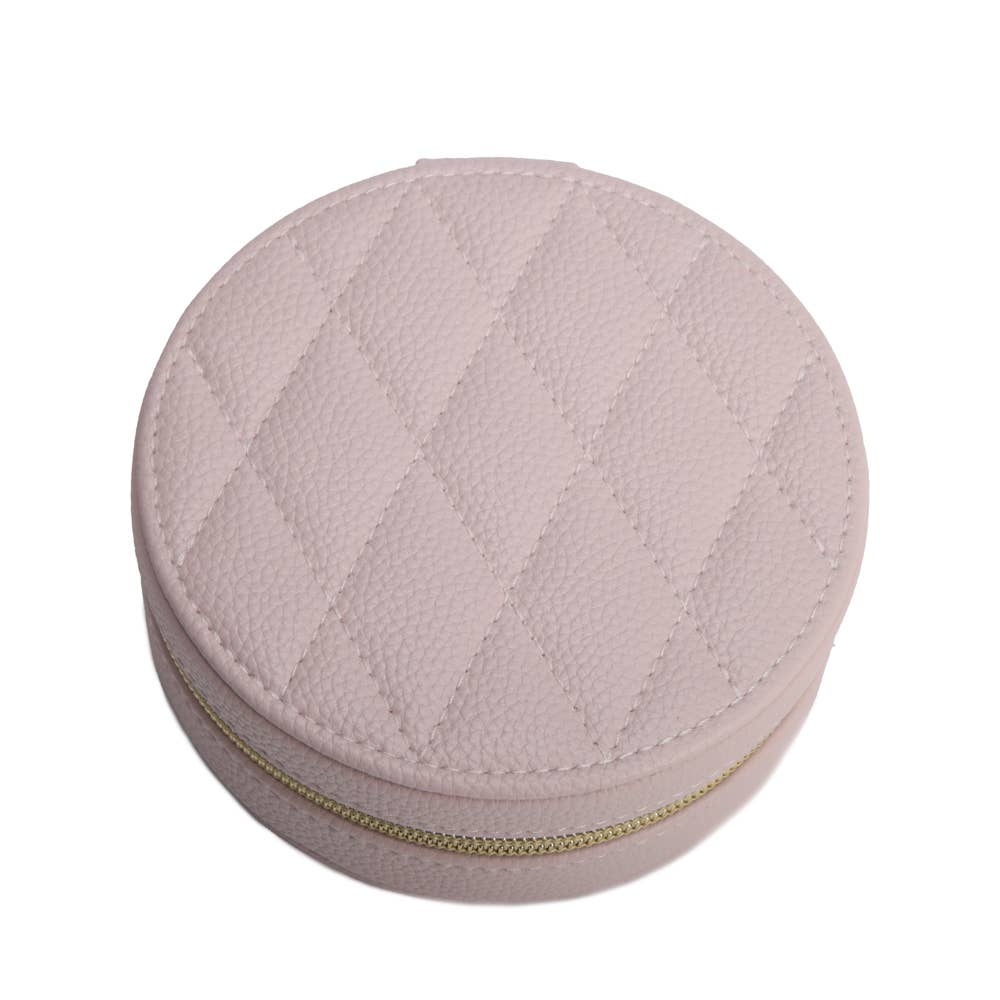 Introducing Leah Quilted Round Travel Jewelry Case - crafted with premium quilted vegan leather, this stylish case is a practical storage solution. Not just for travel, it is perfect for everyday use as well. Keep it on your dresser or vanity for easy access to your go-to pieces or take it with you to the gym or office. Compact and lightweight, it fits effortlessly in your purse or luggage, making it the ideal companion for any occasion. With a convenient zipper closure, your jewelry will stay securely in place, so you can jet set without worrying about losing your valuables. But that's not all, inside you will find a slit pocket for stashing small items, two open compartments, and nine rows of pillows to hold your earrings or rings in place!