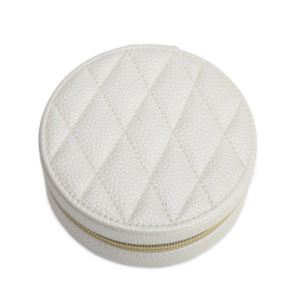 Leah Quilted Round Travel Jewelry Case: Pearl White