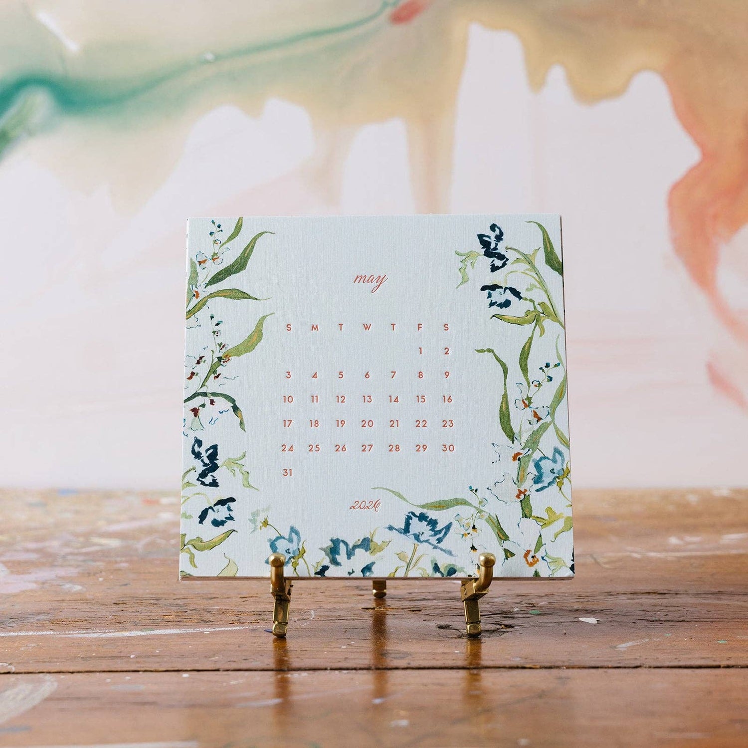 2026 Calendars are in stock and ready to ship! Twelve watercolor designs and letter-pressed numerals on 6" square cards. Nestled in a collectible linen box. Please note, this calendar is not sold with a display option. If you'd like either a clear acrylic base or a brass easel, be sure to add one to your order. Gold Stand Included.