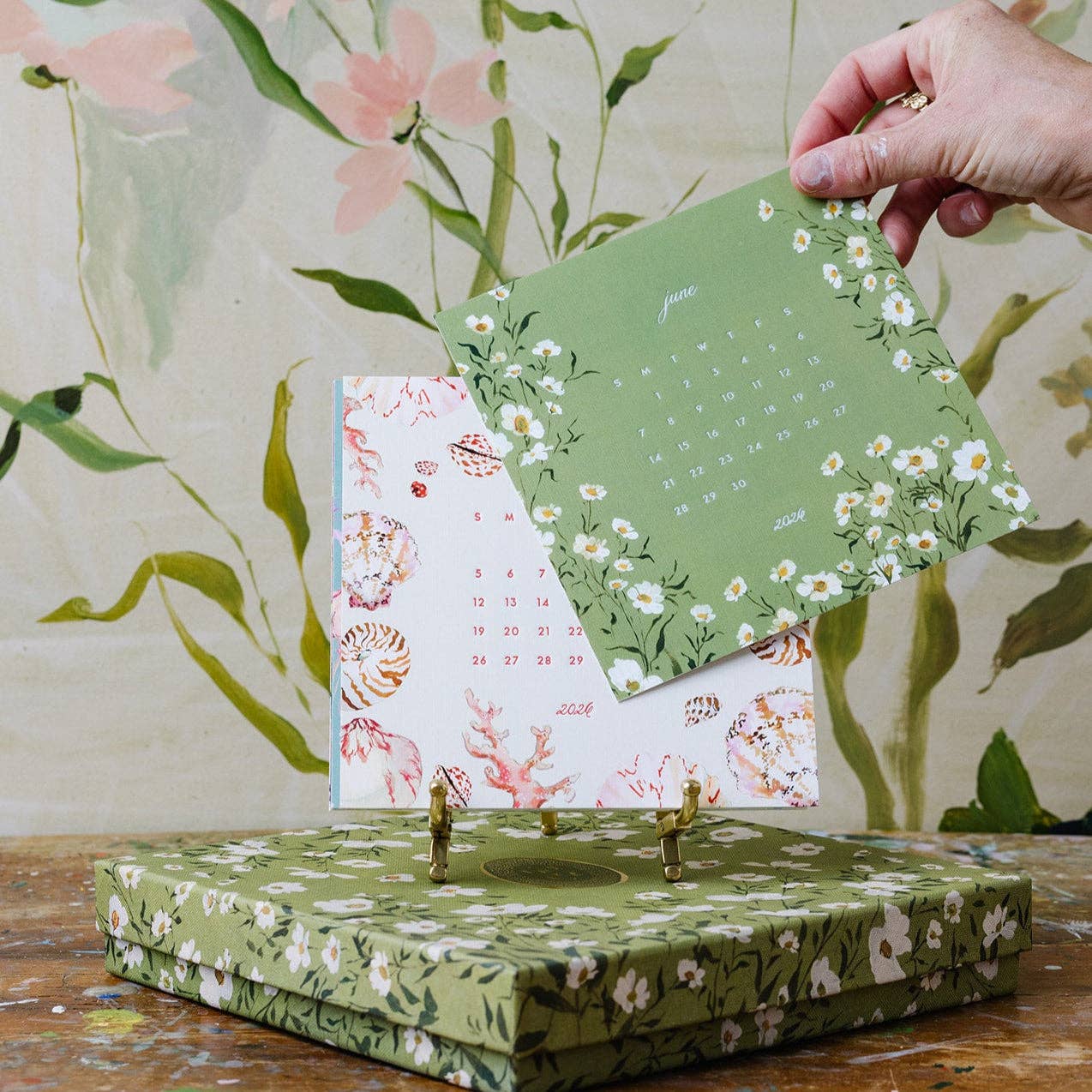 2026 Calendars are in stock and ready to ship! Twelve watercolor designs and letter-pressed numerals on 6" square cards. Nestled in a collectible linen box. Please note, this calendar is not sold with a display option. If you'd like either a clear acrylic base or a brass easel, be sure to add one to your order. Gold Stand Included.