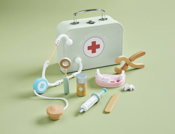 8-piece set. Wooden medical kit set includes stethoscope, medicine, syringe, tongue press, magnifying glass, pliers and set of teeth. Comes in sturdy paper wrapped suitcase94
