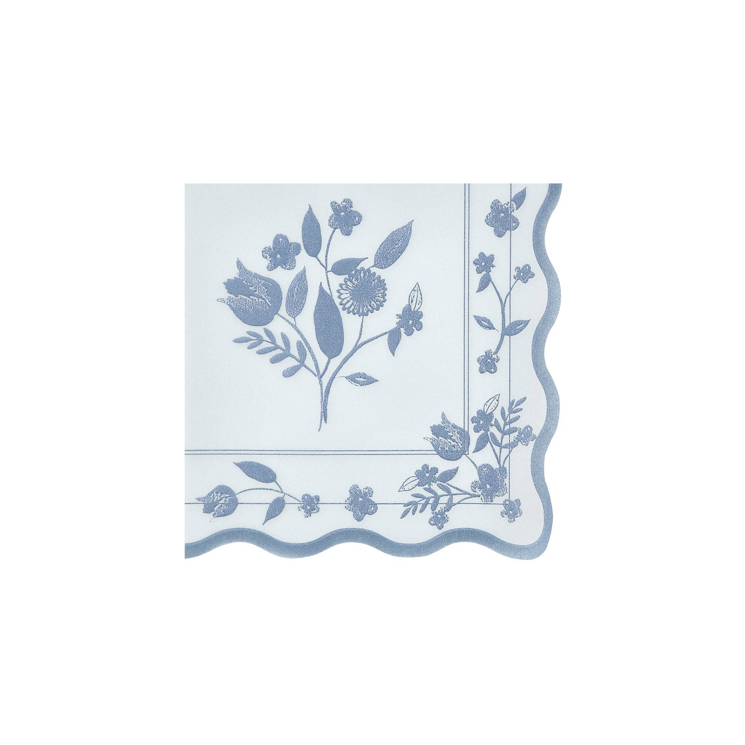 Add a sophisticated touch to your table with this set of small pastel paper napkins. Soft shades of pink, blue, green and yellow, provide a fresh backdrop for cobalt blue botanical illustrations, inspired by vintage dinnerware. The design brings timeless style, while a wavy edge adds refined detail. Ideal for spring soirées, bridal showers, chic picnics, baby showers or any grown-up gathering.