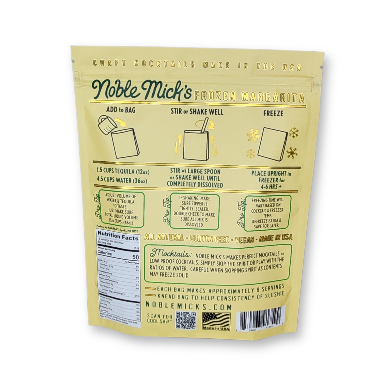 Frozen Cocktails don't get easier than this! Each bag makes 8 servings. No blenders ever! Simply add 12oz Tequila and 36oz water shake or stir and throw in the freezer. 100% all natural ingredients and perfect to share with friends and family at your next party. Cheers from Noble Mick's