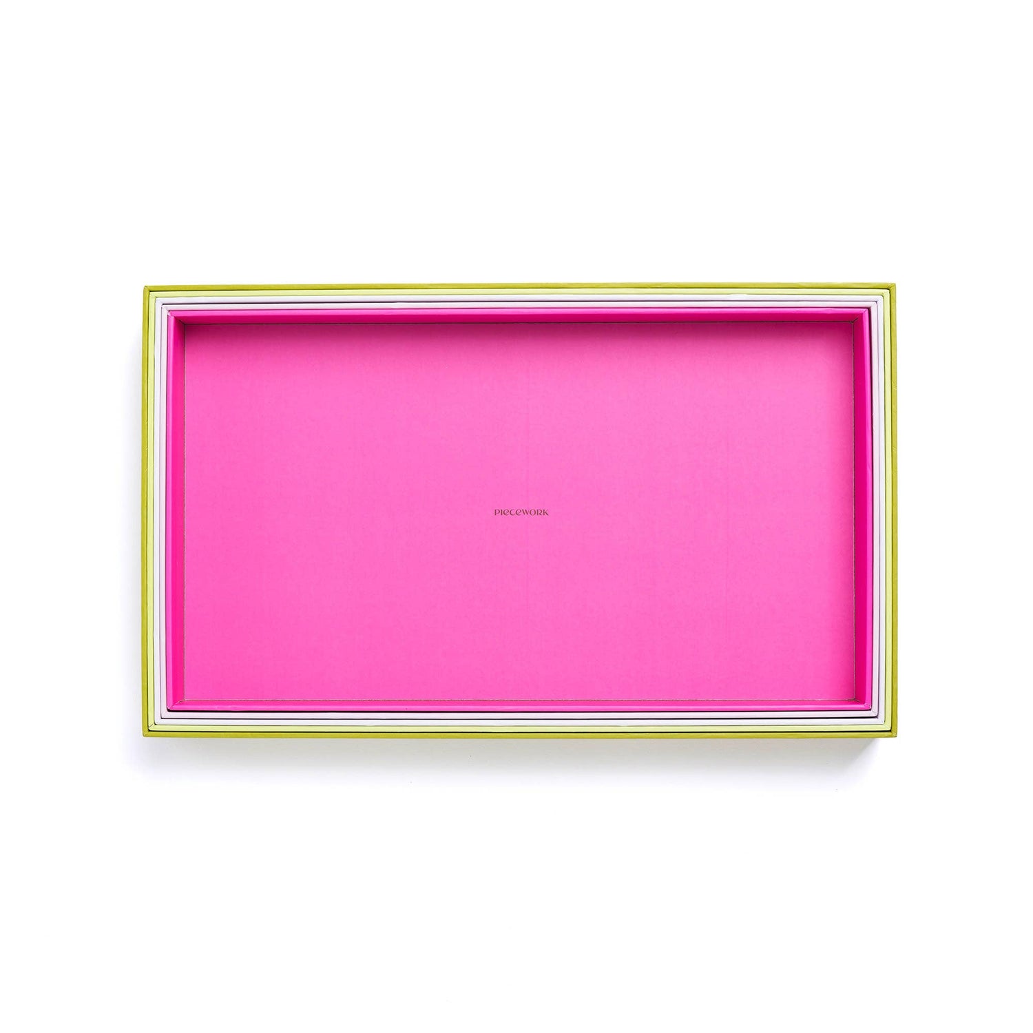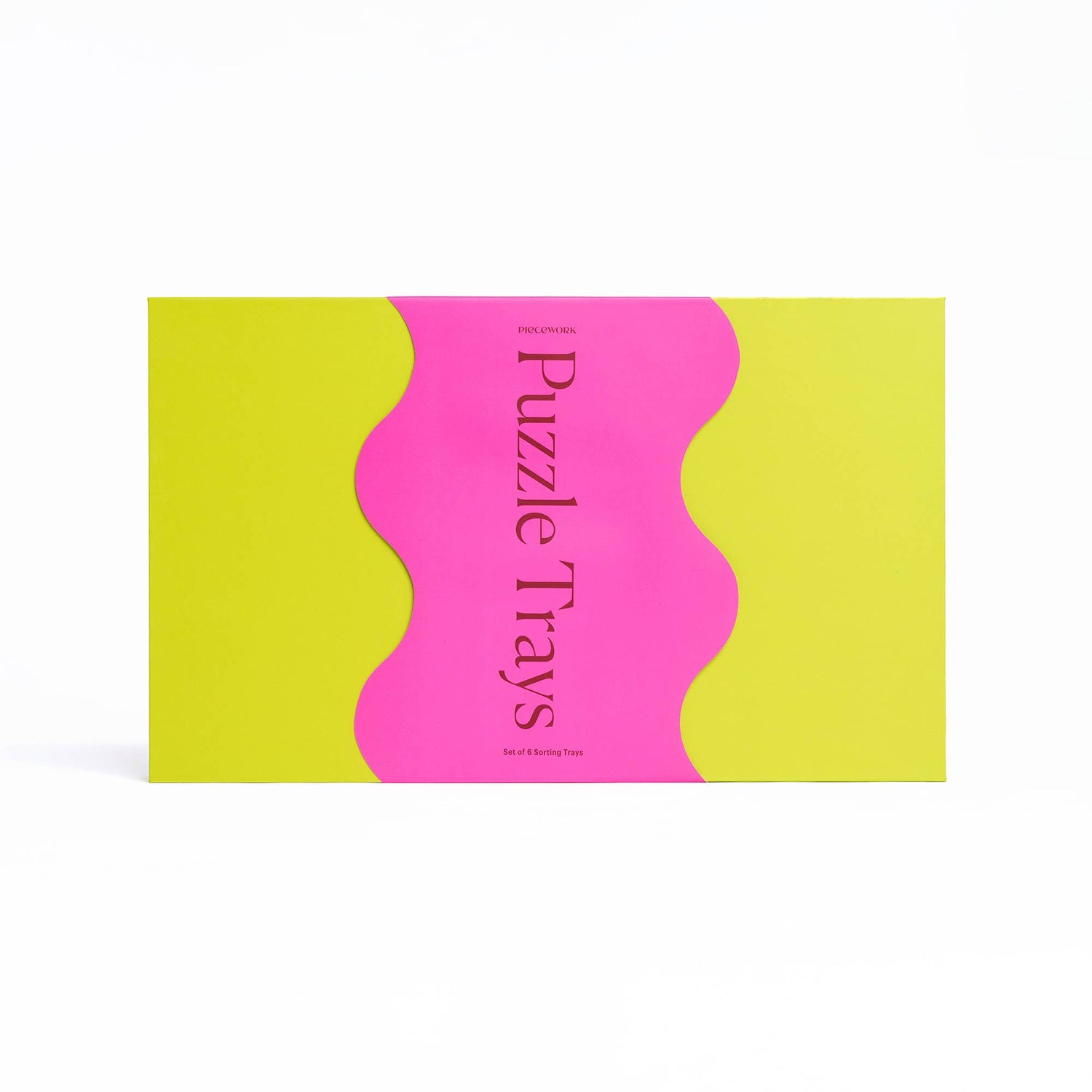 Pass the pieces! Our set of six colorful nesting puzzle trays offer the perfect setup for working on a puzzle. After spending thousands of hours thinking about and working on puzzles, we decided to make our ideal jigsaw accessory. Our set of puzzle trays: