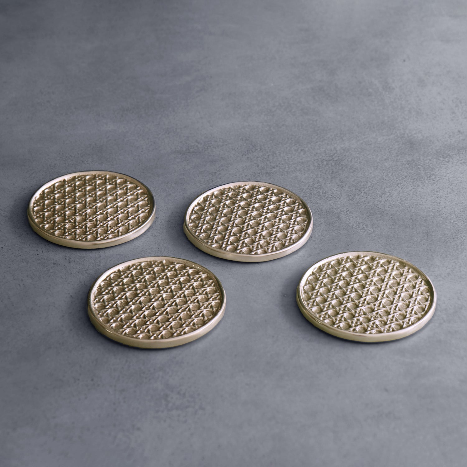 The four round metallic discs contained in Beatriz Ball's SIERRA MODERN Rattan Coaster Set of Four (Gold) are sophisticated, rich in texture, and add a classic (and classy) element to the table. Fabulously functional, they make a luxurious grouping for the bar, too. A number one trend in decorating, Rattan has an ability to feel both contemporary and vintage at the same time and transcends all interior styles and trends. Stunning pieces, timeless and unique, this collection brings to market designs that have never been seen before. Dishwasher safe, pieces will not chip, peel, or stain. Beatriz Ball’s intensely handmade products use eco-friendly and sustainable materials and are crafted by artisans who trace a heritage of metalworking for generations. Made of a top quality, FDA safe, easy-care aluminum alloy.
