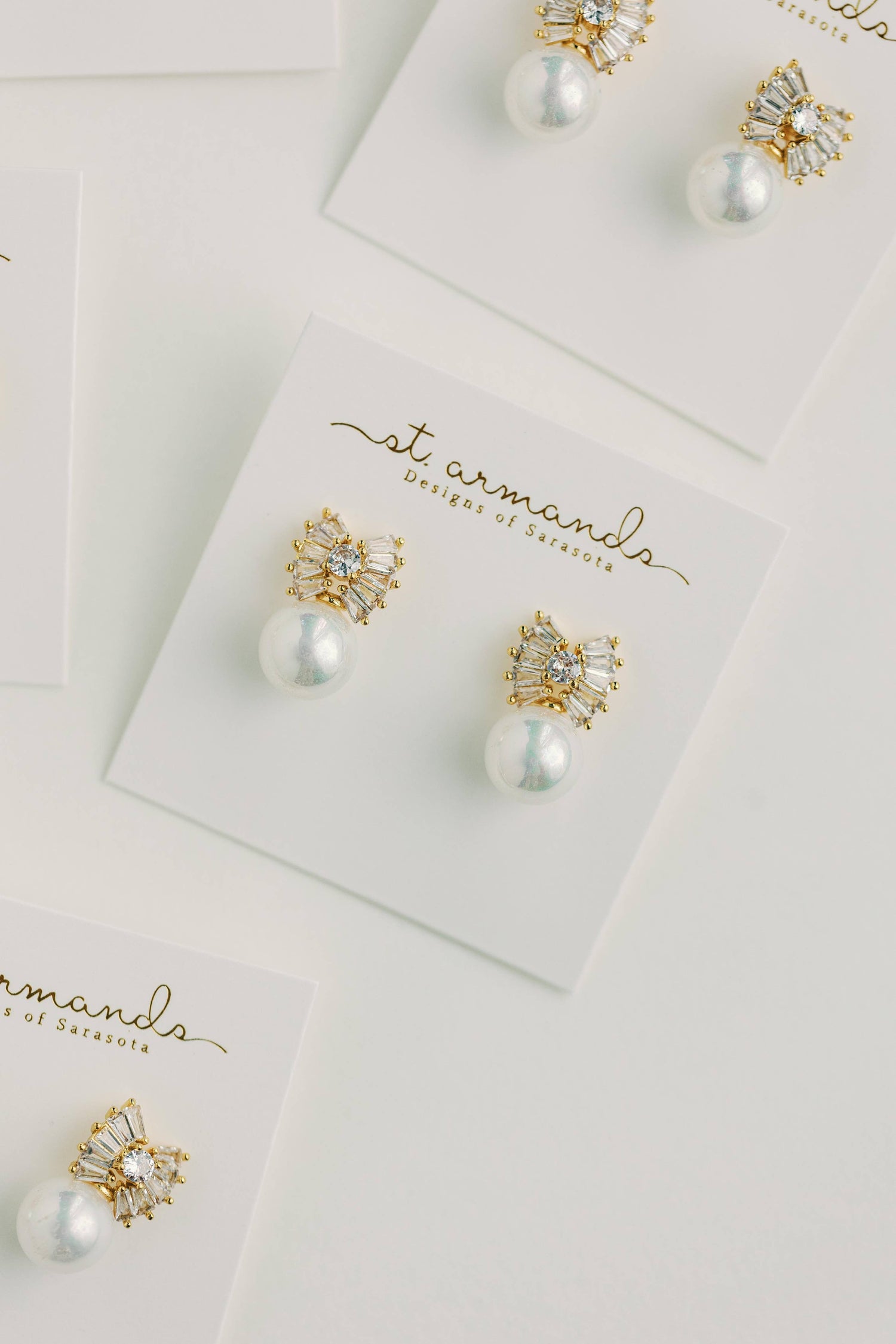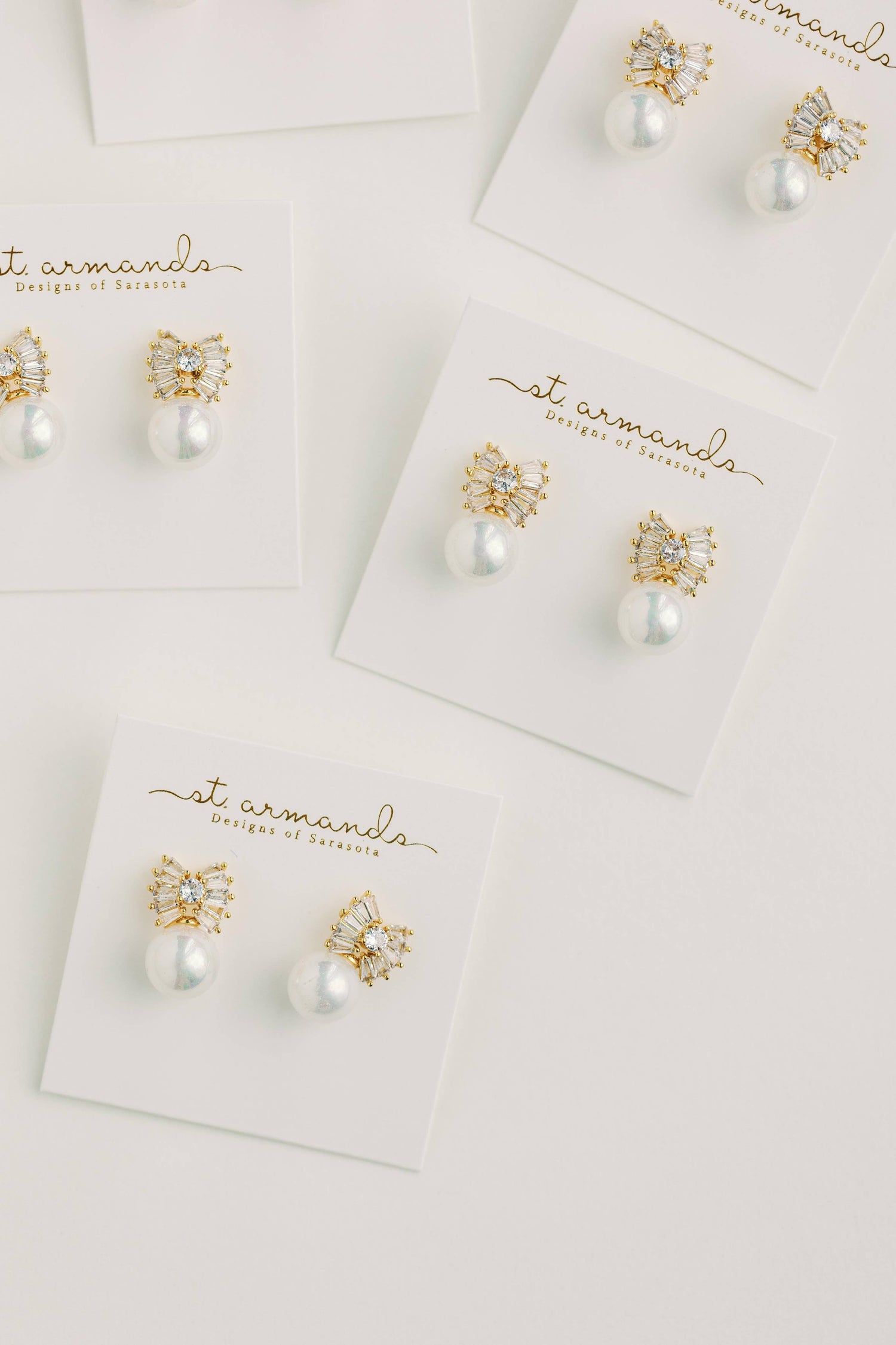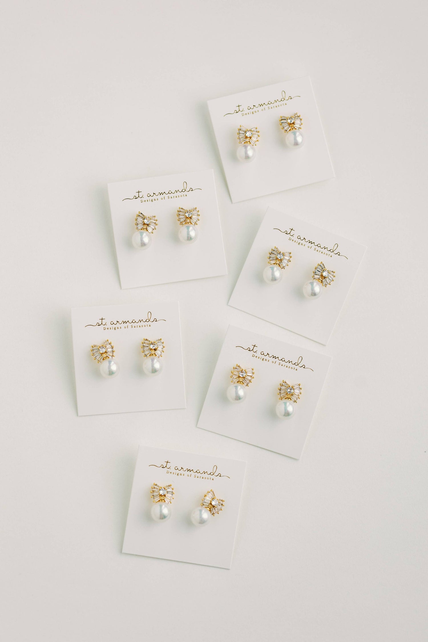 St Armands Designs of Sarasota - Gold Pearl Sparkler Statement Bow Earrings