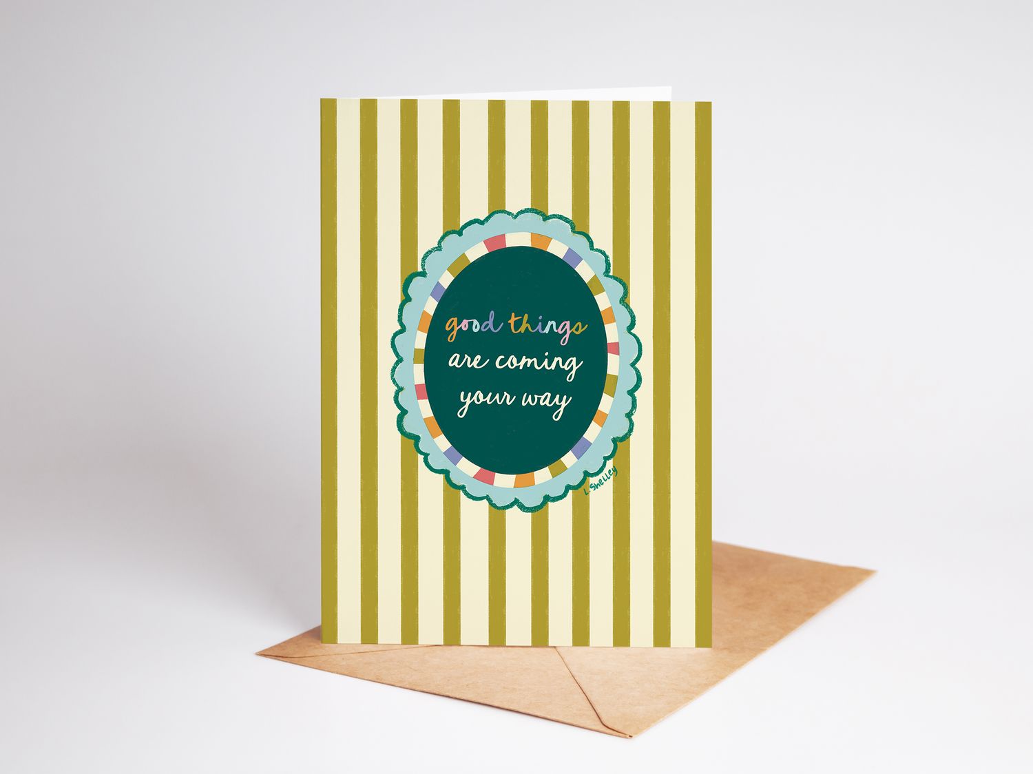 Send some encouragement with this hopeful 5x7 card, featuring the phrase "good things are coming" on a green striped background. The card is blank inside for your own personal message, and comes with a brown kraft envelope. Perfect for encouragement, congratulations, retirements, promotions, and more!
