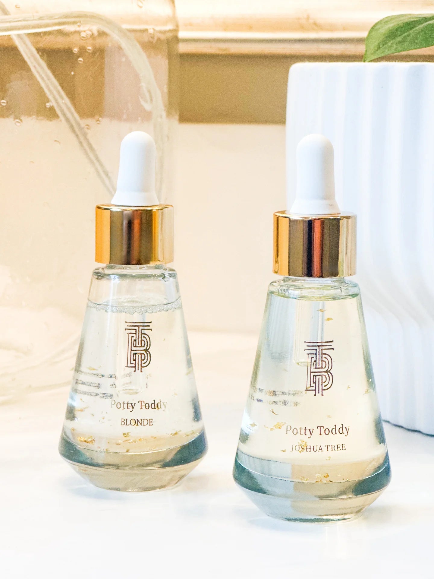 Want a discrete way to go potty? Try out our Potty Toddy drops. Not only is it good looking with 24 karat gold flakes floating around in it, but it makes your bathroom smell good too!