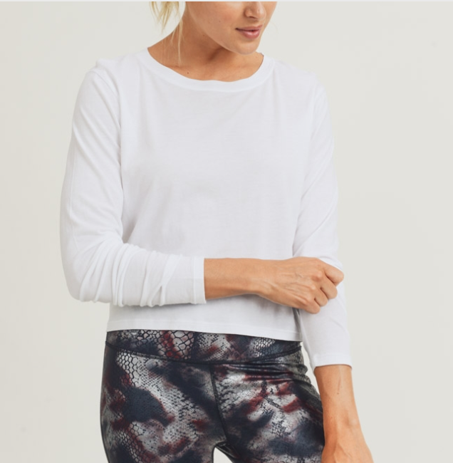 This long-sleeved top was crafted from solid, cotton-modal fabric. It features a cut-out on the back, connected by a wide panel in the middle and a tie accent at the bottom. 50% cotton, 50% modal.